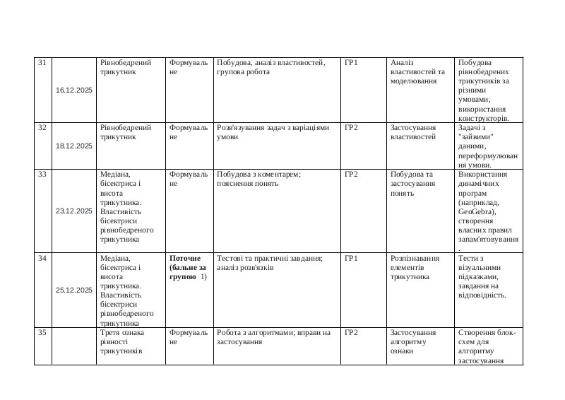 Детальне планування уроків геометрії для 7 класу з алгоритмами, практичними завданнями та критеріями оцінювання рівнобедрених трикутників та ознак рівності.